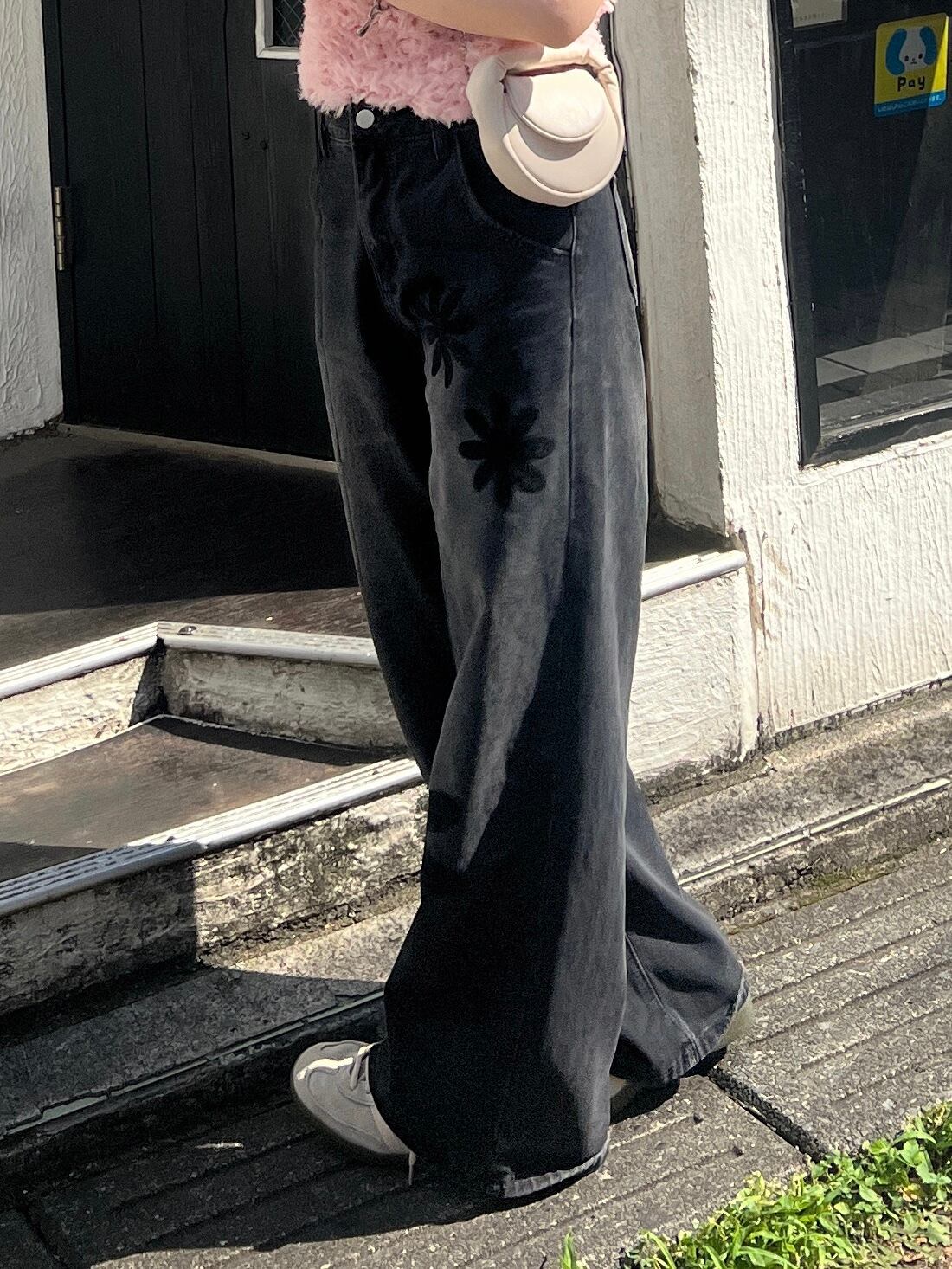 シックなブラックデニムにブラックフラワーをあしらい、大人っぽさの中に遊び心をプラス。モードなスタイリングにも合わせやすく、足元やバッグで差し色を楽しむのもおすすめです。