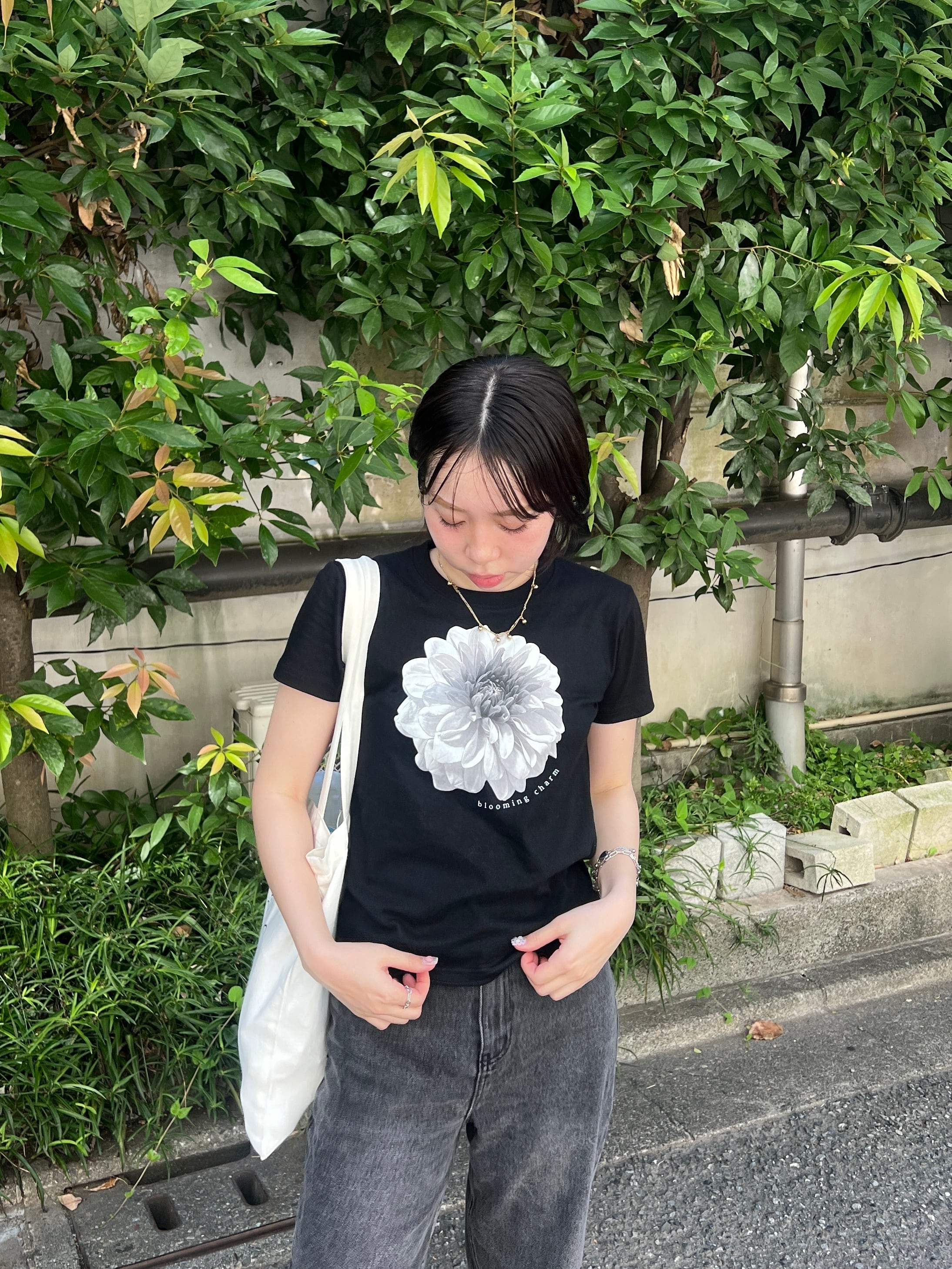 モノトーンの花柄がシンプルながらも奥行きを感じさせ、カジュアルでありながらどこかアートな雰囲気に。