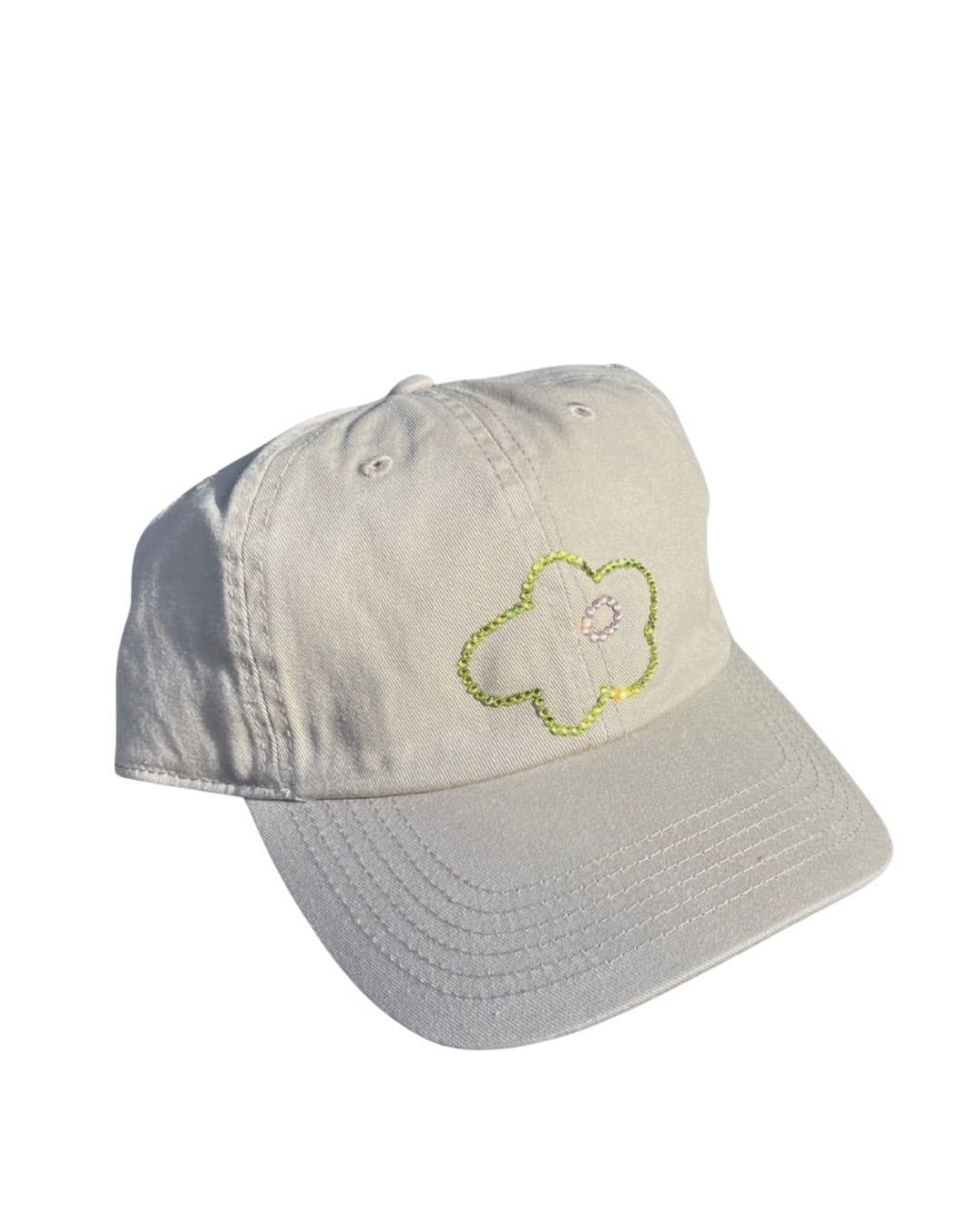 シンプルなキャップに、ラインストーンで縁取ったフラワーモチーフが映えるデザイン。